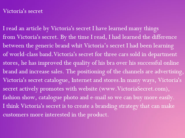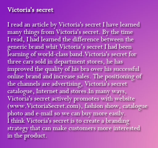 I read an article by Victoria's secret I have learned many things from Victoria's secret. I have learned the difference between the generic brand whit Victoria's secret I have learned of world-class band. Victoria's secret for three cars sold in department stores, he has improved the quality of his bra over his successful online brand and increase sales. The positioning of the channels of advertising, Victoria's secret catalogue, Internet and stores. Victoria's secret www.VictoriaSecret.com launched by promoting a wide range of both fashion show, catalogue photo and e-mail so we can buy more easily. I think Victoria's. secret is to create a branding strategy that can make customers more interested in the product.
